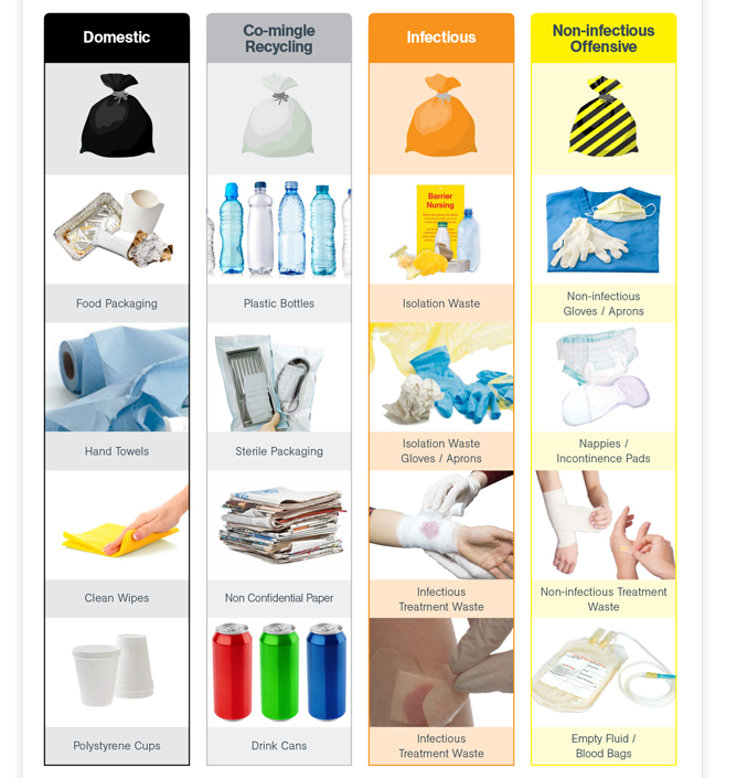 Bags that are used for waste disposal have a colour coding which will be specific to the type of waste: